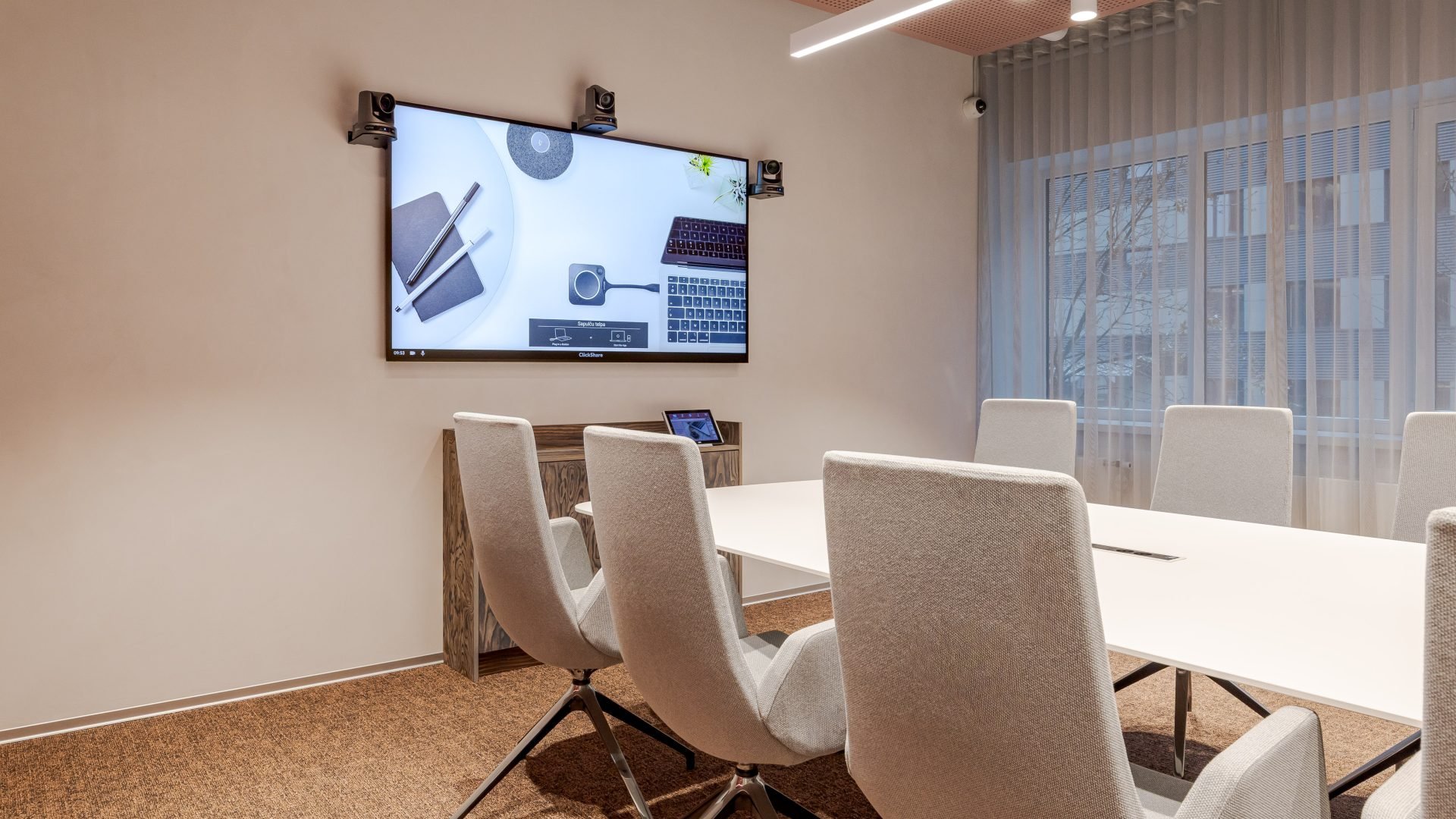 - bezvadu prezentācijas sistēmu Barco ClickShare – pieslēgums portatīvajam datoram tiek nodrošināts bez kabeļiem, vienlaicīgi atbalstot augstas veiktspējas prezentācijas iespējas uz telpā esošā displeja, kā arī videokonferenču bezvadu pieslēgumu;audiovizuālās komutācijas aprīkojumu;